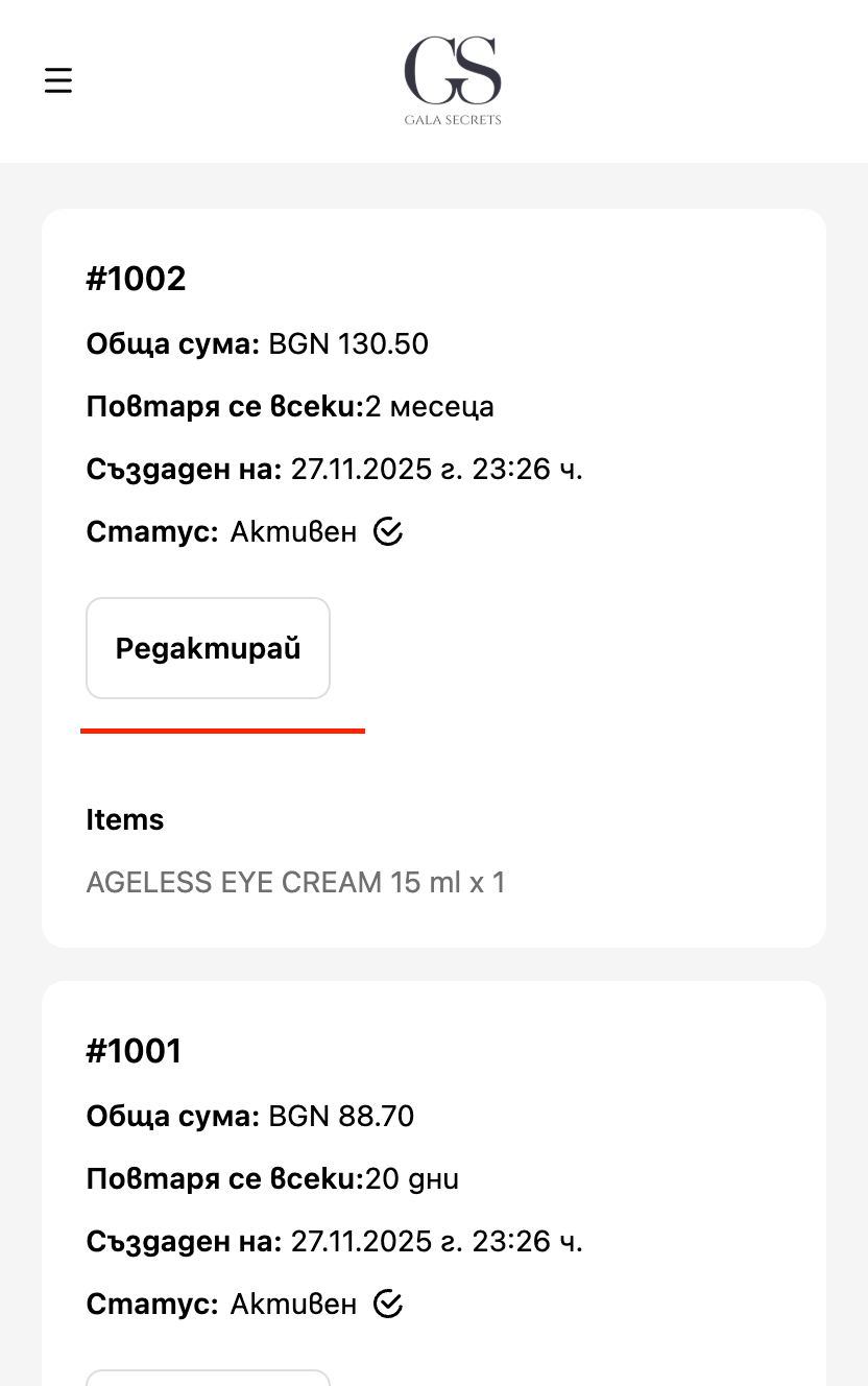 За да управлявате Вашите абонаменти в GALA SECRETS, е необходимо да сте влезли в своя клиентски профил с същия имейл адрес, с който сте направили покупката на абонамента.